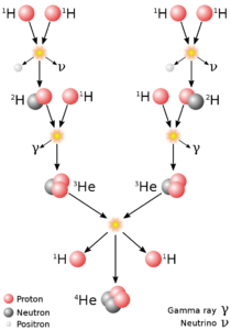 元素記号H、原子番号1の元素、水素。宇宙の始まりは水素からだと考えられている。ビッグバンのあとすぐに電子やニュートリノなどの素粒子が生成し、その後順番に陽子(水素の原子核または水素イオンともいう)や中性子が生成したようだ。さらに重水素を原料としてそこに陽子が核融合してトリチウムやヘリウムなど順番に大きい元素が作られたと考えられている。宇宙ではこのように核融合が順に起きることで原子番号の大きな原子が次第に作られていった。図の陽子-陽子連鎖反応は太陽などの恒星の中で繰り返して行われている核融合反応の一種の反応で、陽子からヘリウムが生成される様子が示されている。