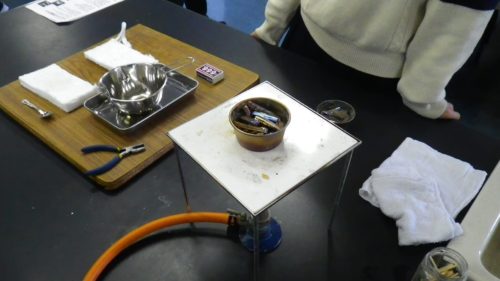続いて結晶づくりに入っていきます。結晶を作るにあたっての工程を一通り説明させていただいた後、ステンレス製カップにビスマスを必要量入れます。小さなステンレス製カップは見た目以上に非常に重たくなるので溶かし込み前に、ビスマスを入れたステンレス製カップを持って重さを感じてもらい、結晶づくりの工程を先にイメージしていただきます。