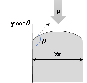 計算式は、図のように孔を円柱にみたて、表面張力γで接触角θの液体(ここでは水銀)が入ると、表面張力によって液体を押し出す方向に働く力-2π r γ cos θ が発生する。この力に対して液体を押し込む方向に加わる力πr2p が等しくなることを使う。これより、r p =-2 γ cos θという関係式(Washburn の式)が得られる。水銀の接触角θは140°なので加えた圧力pから細孔径を計算できる。