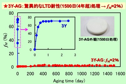 そこで、東京大学の幾原教授および東ソー株式会社の松井主席研究員らは、長期間安定なLTD耐性のイットリア安定化ジルコニアの合成に取り組み、これまでに提唱されていた理論では説明されない新たな相転移の現象を発見し、驚異的な LTD耐性のジルコニアの合成に成功した。この成功には、焼結温度が1300℃を超えると粒界に偏析した高濃度Yを起点にしてT相の中にC相の領域が成長していく“粒界偏析誘起相変態が起こっていることを発見したことが関連している。さらに焼結温度の選定を丁寧に行い、ごくわずかな添加物効果の知識と経験を駆使して常圧焼結可能な粉末を開発できたことが驚異的なYSDの合成を導いた。