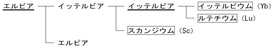 ユルバンの研究に先行して,1878年,スイスの化学者J.マリニャクは,ガドリン石からのエルビア(下図で下線のあるエルビア)から得られた硝酸塩の熱分解という方法で二つに分割しました。ユルバンは,マリニャクのこの業績に敬意を表してイッテルビアの名を継承して自身が分離した一方にネオイッテルビア(Neoytterbia)の名を付け,他方は,パリの古名からルテシア(Lutecia,後にLutetia)と名付けました。前者がイッテルビウムの酸化物に相当します。
