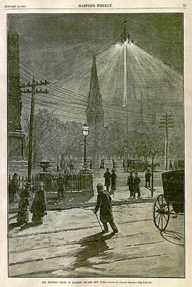 アーク灯の街路照明が街のガス灯の照明に取って代わるためには発電機の改良をも必要としました。ロシアの電気技術者P.ヤブロチコフは,それまでのアーク灯装置の電極間距離を調整する複雑な機構を簡素にし,発電機も改良してアーク灯による電気照明を構築し,フランスで「電気蝋燭」の特許を取得しました。1878年のパリ万国博覧会では,オペラ座大通りにヤブロチコフのアーク灯64基が設置されました。