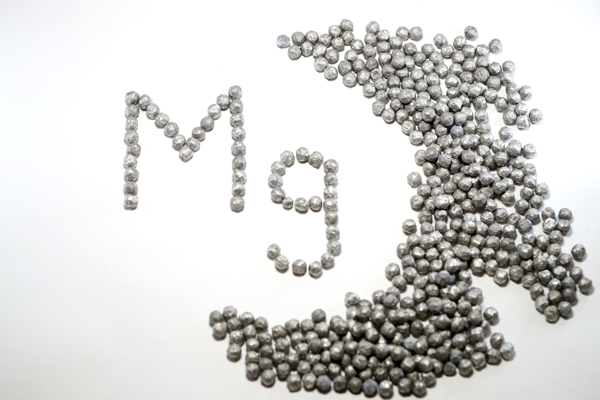マグネシウム(Mg)は原子番号12、原子量24.305、アルカリ土類金属です。比重1.738の軽金属で、合金の原料として有用です。燃焼すると非常に明るい光を出すので、かつてカメラのフラッシュとして使われました。研究室ではグリニヤール試薬として、有機合成の試薬に使われます。塩化マグネシウムは高濃度で蛋白凝固作用があり、にがりの主成分として豆腐作製の凝固剤として使われます。また、植物での光合成を行うクロロフィルを構成する金属です。