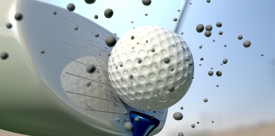 図2:ゴルフクラブのヘッドがボールに当たる瞬間。この時のヘッドスピードが速いほど、ボールはよく飛ぶ。