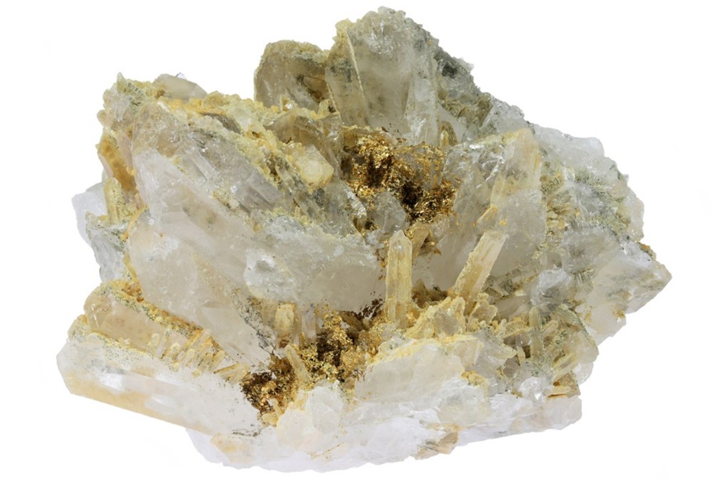 図1 金の粒が付着している水晶。コロラド州イーグルマイン産。