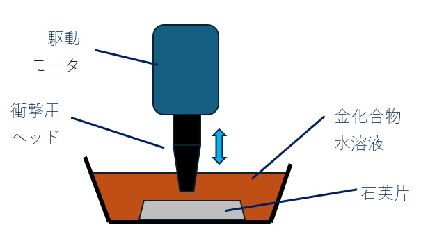 オーストラリアモナシュ大学のC. R. Voisey博士らは、石英と一緒に金の塊が出来ることは、石英の圧電性から説明できると考えました。地殻の奥深くで、金を含む溶液があり、石英が地震によって機械的な力がかかると電圧が発生し、これによって金が石英表面に析出するのではないかということです。このことを確認するために、研究者らは図2のような装置を作って実験を行いました。石英片を金の化合物(H[AuCl4])の水溶液に入れ、上部から垂直に振動する金属棒で振動を加えるという実験です。
