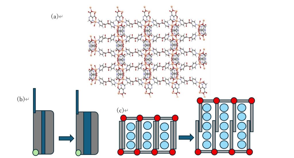 図4 (a)北川博士らが開発したMOFの構造の一例(文献4のデータから作成)。(b)荷物の量に応じて、大きさを変えることができるキャリーバッグ。 (c) キャリーバッグのように構造が変化することで気体を多く収納できるMOFのイメージ。