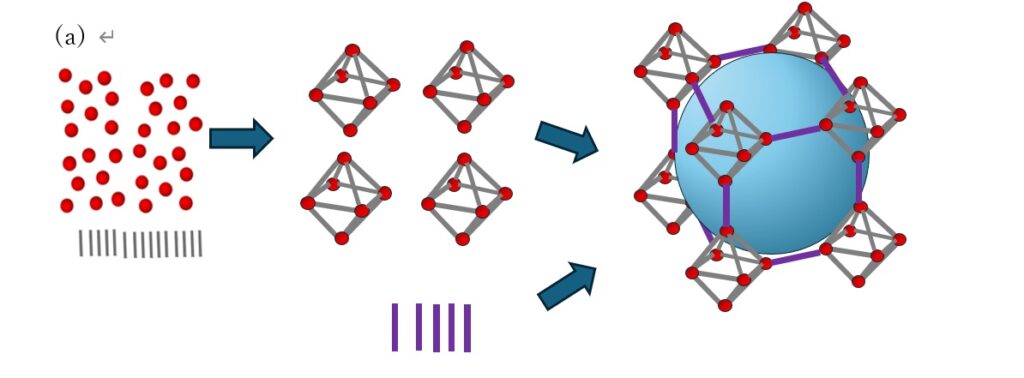 図5 (a) 金属と有機物からMOFの頂点部分ををつくり、それらを使ってMOFを合成する際のイメージ図。青い球は空孔部を表す。