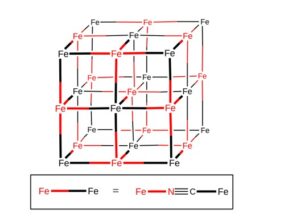 図1 3次元構造を持つターンブルブルー。赤と黒の鉄はそれぞれ+2価と+3価の鉄を表します。https://en.wikipedia.org/wiki/Prussian_blue より