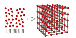 図2 金属(赤玉)と棒状の有機物(灰色)から、3次元MOFを作るイメージ図。