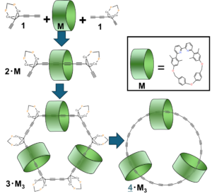 当該の分子は図2の方法で作られました。まず求める分子の部品となる、三重結合を3つ含む化合物(図2の1)を合成します。この1は、炭素8つが順番に結合した構造の部分が含まれ、さらにその一部にはコバルト(Co)原子を含むユニットがつながっています。環状分子Mを別途合成します。Mは(ウナギをとる仕掛けのように)まっすぐな炭素鎖が入り込みやすい性質を持っています。そこで、Mが存在する溶液内で、触媒を用いて2分子の化合物1を結合させると2・Mが得られます。この2・Mには8個の炭素が直線上に連なった部分があり、Mの穴の中にその部分がはまり込んだ構造となっています。分子の両側は大きな部分(コバルトを含む部品)がついているので、このような構造になるとMは抜けなくなります。2・Mには中央の直線部分以外に炭素鎖が両側に4個ずつついており、16個の炭素鎖があることになります。こうしてできた2・Mを3分子結合させると炭素が48個環状となった3・M3が生成します。これに強力な酸化剤を作用させることで、コバルト部分が外れて、最終目的物である4・M3が得られました。