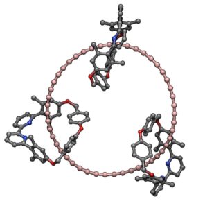 今回報告されたのは48個の炭素が環状につながったC48です。48個の炭素原子が、三重結合と単結合が交互につながっていき、円形となっています。ただ、完全にC48のみではなく、C48に別の少し小さな環状有機分子が三分子はまっているような分子です(図1)。複数の環状の分子が(知恵の輪のように)共有結合をつくらずにつながっている化合物をカテナンと呼びますが、これもカテナンの一種です。これまでに、炭素のみからなる環状分子は多くのもの(C6からC26までの様々な分子)が報告されてきました。これらは固体表面上に、走査型プローブ顕微鏡と呼ばれる装置を用いて極低温(4K – 10K)で、原子1個1個を並べて作られたもので、溶液中、しかも室温で安定なものを作る試みはことごとく失敗してきたのです。しかし、 今回英国の研究者たちは図1のような分子を合成することに成功しました。驚くべきことに、この分子は溶液中、室温でも十分分析を行える程度に安定であることが分かったのです。